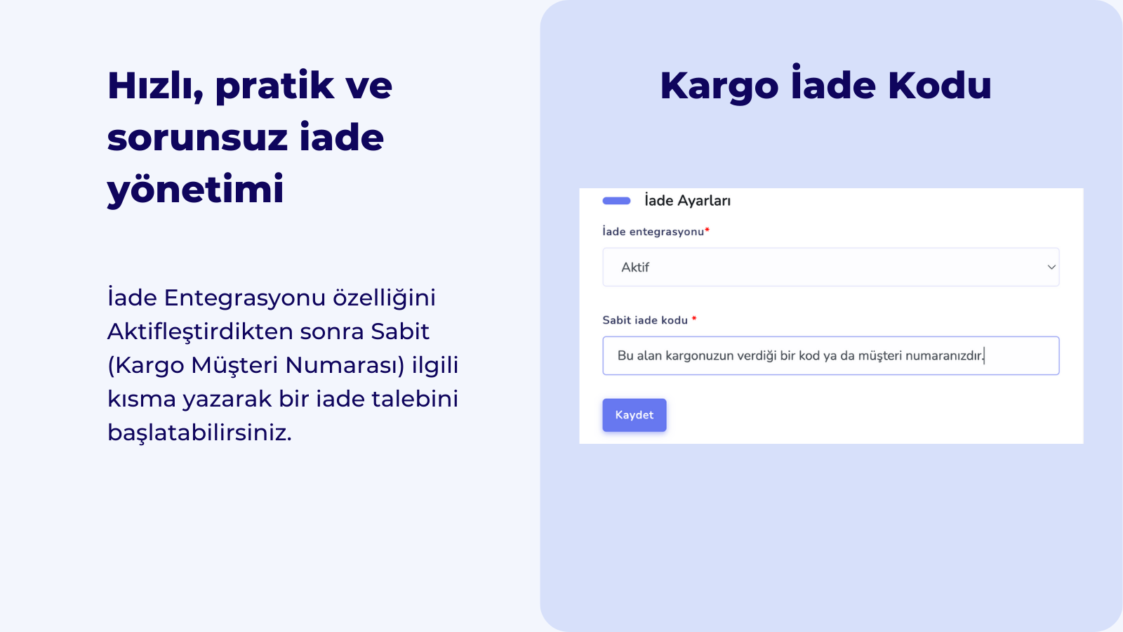 Kargolarınızın iade süreçlerinde uygulama içerisindeki İade Ayarları bölümünü aktifleştirerek kullanabilirsiniz. Değişim için gelen siparişlerinizi ise Tekrarlı Gönderim özelliğini kullanarak müşterinizin adresine yeni bir barkod ile gönderebilirsiniz.